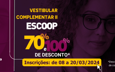Inscrições abertas para o Vestibular Complementar II da ESCOOP Inscrições podem ser feitas até o dia 20 de março de 2024 Estão abertas as inscrições para o Processo Seletivo Complementar II - Vestibular 2024 da Escola Superior do Cooperativismo – ESCOOP, para o...