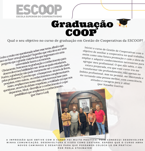 “Ao longo do 1º semestre de 2023, a turma 2022 de graduação de Gestão de Cooperativas da ESCOOP foi instigada, entre muitos, à elaboração de um Informativo Cooperativista tanto em forma como em conteúdo. Desta instigação nasceu o FALA COOP, resultado do empenho e do comprometimento de estudantes que “dodiscentemente” materializaram o cooperativismo por diversas narrativas”, destaca a Professora Rosane.