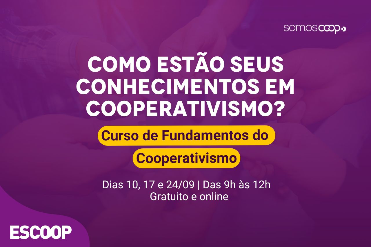 Com o objetivo de ampliar o conhecimento sobre os valores, princípios e estrutura das sociedades cooperativas, a Escola Superior do Cooperativismo (Escoop) abre as inscrições para o Curso de Fundamentos do Cooperativismo. A capacitação gratuita será realizada de forma virtual, com aulas síncronas pela plataforma Teams, nos dias 10, 17 e 24 de setembro de 2025, das 9h às 12h.