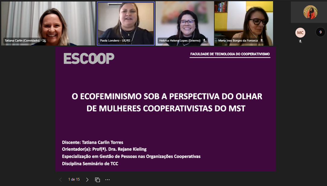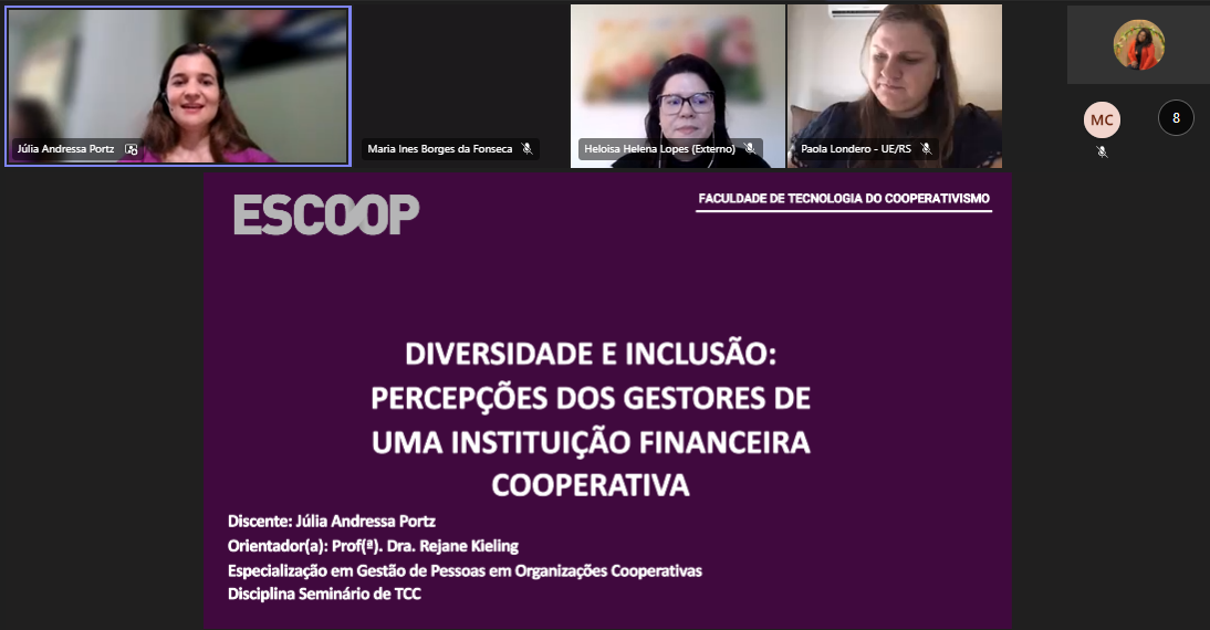 Nos dias 17,18 e 22 de março de 2023 foram apresentados os trabalhos de conclusão de curso (TCCs) dos alunos da Especialização em Gestão de Pessoas em Organizações Cooperativas, oferecida pela ESCOOP. Os TCCs são resultados de pesquisas realizadas pelos alunos ao longo do curso, que abordam temas relevantes para o desenvolvimento do cooperativismo e da gestão de pessoas.