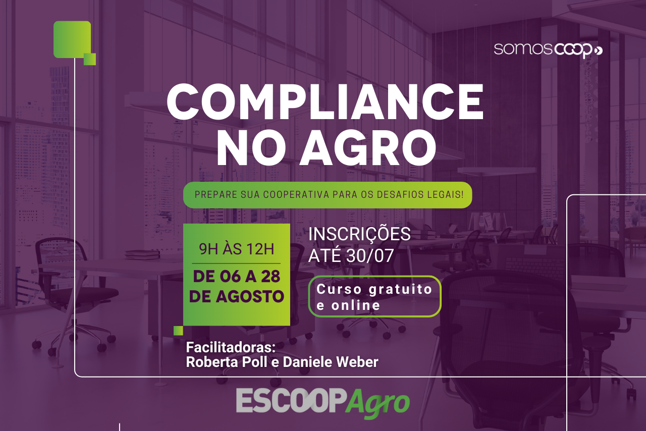 Estão abertas, até o dia 30 de julho, as inscrições para o Workshop sobre Compliance no Ramo Agropecuário, promovido pela Escola Superior do Cooperativismo (Escoop). A formação, ofertada na modalidade on-line e gratuita, é direcionada a cooperados e colaboradores de pequenas e médias cooperativas agropecuárias registradas e regulares no Sistema Ocergs.